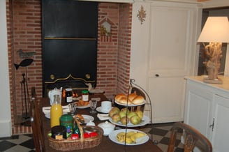 Vous trouverez à votre disposition tout un assortiment de boissons chaudes (thé, chocolat, café, lait ...) ainsi que du jus d'orange. Par ailleurs, viennoiseries et pain frais du jour seront agrémentés par les confitures "maison" préparées tout au long de l'année par Pascale : mûres de la forêt de Crécy, gelée de pomme, gelée de cassis, rhubarbe et des plus originales.....courgette-gingembre, potiron-orange, argousier, enfin.....ce que les gourmands ont bien voulu laisser dans les placards !